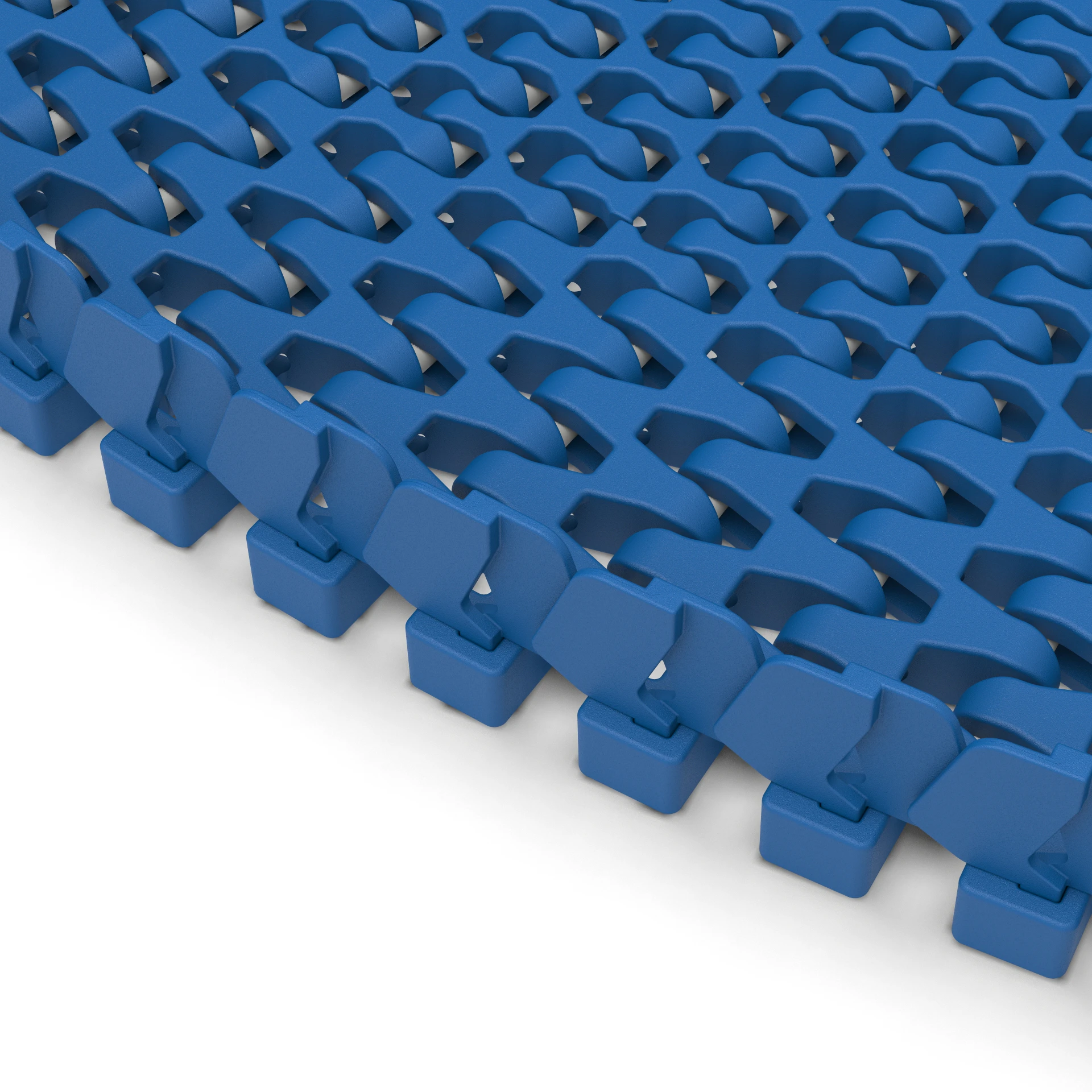 Side-flexing flush grid belt designed for optimal drainage and easy cleaning in curved conveyor layouts.