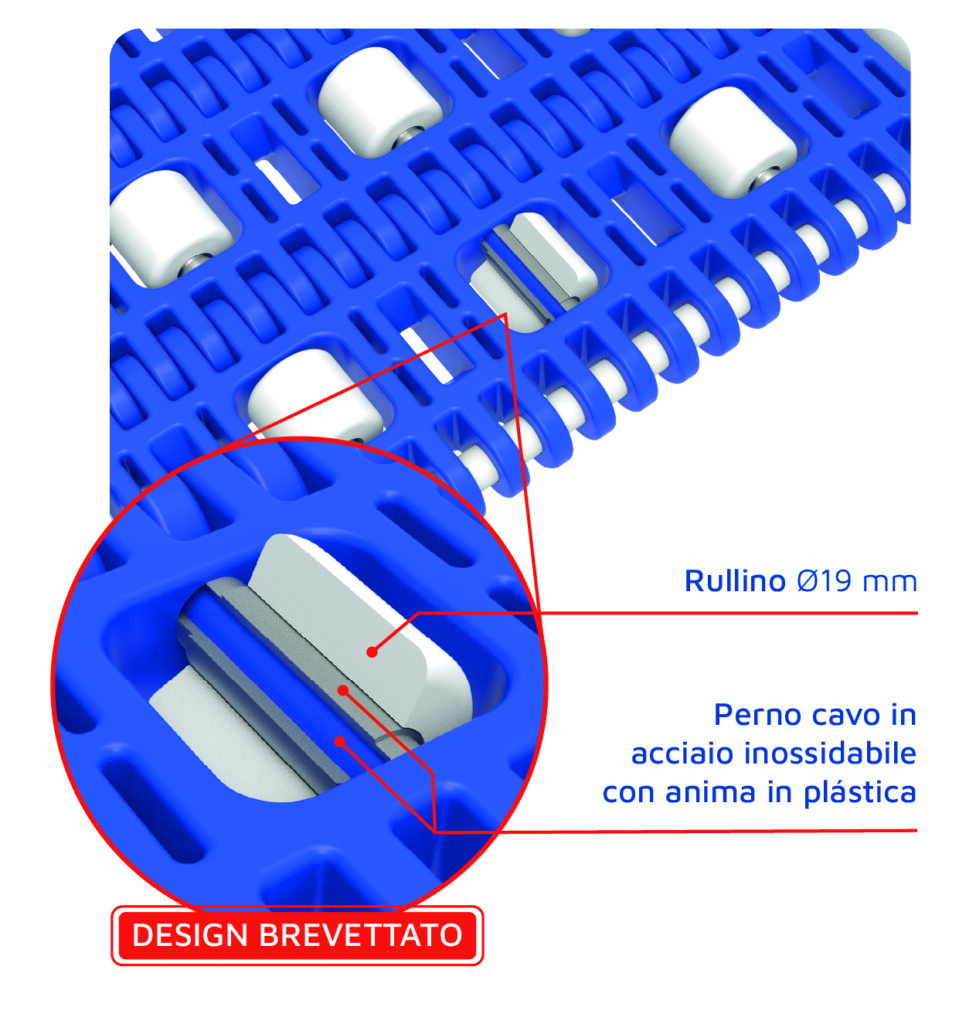 Grazie al nostro processo brevettato, il rullo ruota su un perno in acciaio inossidabile che viene riempito di plastica durante il processo di stampaggio a iniezione. In questo modo, generiamo un rinforzo aggiuntivo nel modulo di plastica. Questa tecnica ottimizza la stabilità dimensionale del nastro sotto sforzo continuo e aumenta significativamente la resistenza alla trazione, offrendo il massimo della durata sul mercato.
